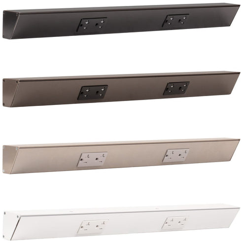 The patented TR Angle Power Strip mounts under cabinets and is an ideal alternative to standard outlets that are cut into tile, glass, wood panels, metal and other solid surfaces. The fixture is easily hidden, while the angle offers easy access to receptacles. Use under kitchen cabinets, vertically along the sides of a bathroom mirror, on the top of an office desk, in the shop, craft room and home entertainment center. Custom options include length, additional receptacles, data devices, and switches for lights and garbage disposal. All standard receptacles are 20 amp duplex tamper resistant. Meets 2008 NEC. Mounting hardware included. Requires installation by licensed electrician.